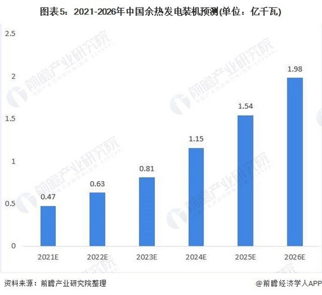 當(dāng)前,余熱發(fā)電裝機(jī)約占全國(guó)發(fā)電裝機(jī)的2%,“十四五”期間,高效節(jié)能技術(shù)的持續(xù)研發(fā)與突破將促使傳統(tǒng)生產(chǎn)過(guò)程升級(jí),余熱余壓利用等工業(yè)節(jié)能細(xì)分市場(chǎng)份額將進(jìn)一步擴(kuò)大,余熱發(fā)電裝機(jī)占全國(guó)發(fā)電裝機(jī)的比重也不斷擴(kuò)大,預(yù)計(jì)2026年全國(guó)余熱發(fā)電裝機(jī)接近2億千瓦。