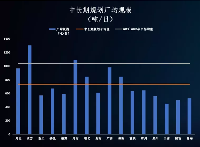 E20研究院通過(guò)對(duì)各省中長(zhǎng)期規(guī)劃的分析發(fā)現(xiàn),中長(zhǎng)期規(guī)劃中新增生活垃圾焚燒項(xiàng)目的廠均規(guī)模已將從2019~2020年的平均值1037噸/日下降至736噸/日,降幅達(dá)到30%。