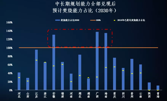 我們認(rèn)為在未來(lái)5~10年的生活垃圾焚燒市場(chǎng)中將更多的充斥著小體量的縣鎮(zhèn)項(xiàng)目,大項(xiàng)目、好項(xiàng)目將減少。另一方面,我們對(duì)各省中長(zhǎng)期規(guī)劃的本底值可靠性進(jìn)行了進(jìn)一步考察,發(fā)現(xiàn)有些省份若以起中長(zhǎng)期規(guī)劃推演,至其規(guī)劃期截止,若全部規(guī)劃能力兌現(xiàn),焚燒能力已經(jīng)超過(guò)了當(dāng)?shù)厣罾a(chǎn)生總量的100%。若該省份人口不能如長(zhǎng)三角和珠三角地區(qū)在未來(lái)發(fā)生強(qiáng)烈吸納作用,則實(shí)際上仍存在落地風(fēng)險(xiǎn)。