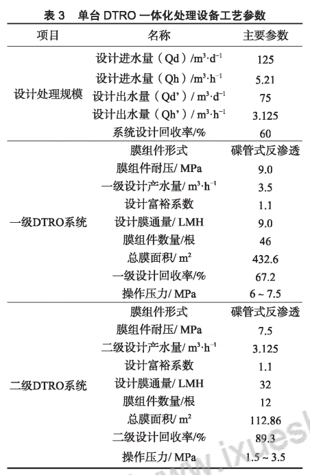 兩級DTRO系統(tǒng)包含了 4臺兩級DTRO 一體化處理設備,每臺設備的主要工藝參數(shù)見表3。