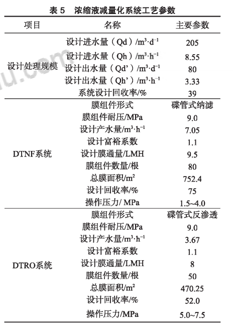 濃縮液減量化系統(tǒng)包含單級DTNF和單級DTRO,用于處理兩級DTRO系統(tǒng)產(chǎn)生的濃縮液, 將兩級DTRO濃縮液再次濃縮,該套系統(tǒng)內的DTRO采用相對低截留率、高通量的RO膜。濃縮 液減量化系統(tǒng)設備的產(chǎn)水再進入兩級DTRO設備中再次處理,能夠實現(xiàn)濃縮液的減量,濃縮液減量 化系統(tǒng)的工藝參數(shù)見表5。