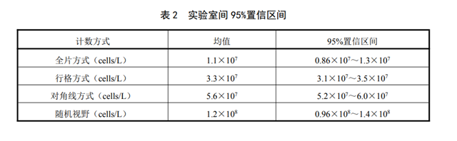 6家實驗室分別用全片計數(shù)、行格計數(shù)、對角線計數(shù)和隨機視野計數(shù)對浮游植物密度為1×107 cells/L、3×107 cells/L、5×107 cells/L、1×108 cells/L 的實際樣品進行了7次重復測定,實驗室內的相對標準偏差分別為2.4%——11%,2.9%——10%,2.7%——11%,4.8%——8.2%;實驗室間相對標準偏差分別為22%、5.6%、7.1%、21%。計算測定結果對數(shù)值的 95%置信區(qū)間,再取反對數(shù)得到的實驗室間95%置信區(qū)間見表2。