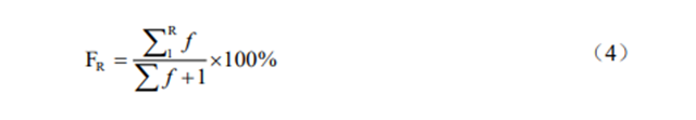 將 lgSMAV 和 lgSMCV 從小到大分別進(jìn)行排序,確定其秩次 R(數(shù)值最小的秩次為1,次之秩次為 2,依次排列,如果有兩個或兩個以上物種的數(shù)值相同,將其任意排成連續(xù)秩次),分別計算物種的急性和慢性累積頻率 FR,計算方法見公式(4):