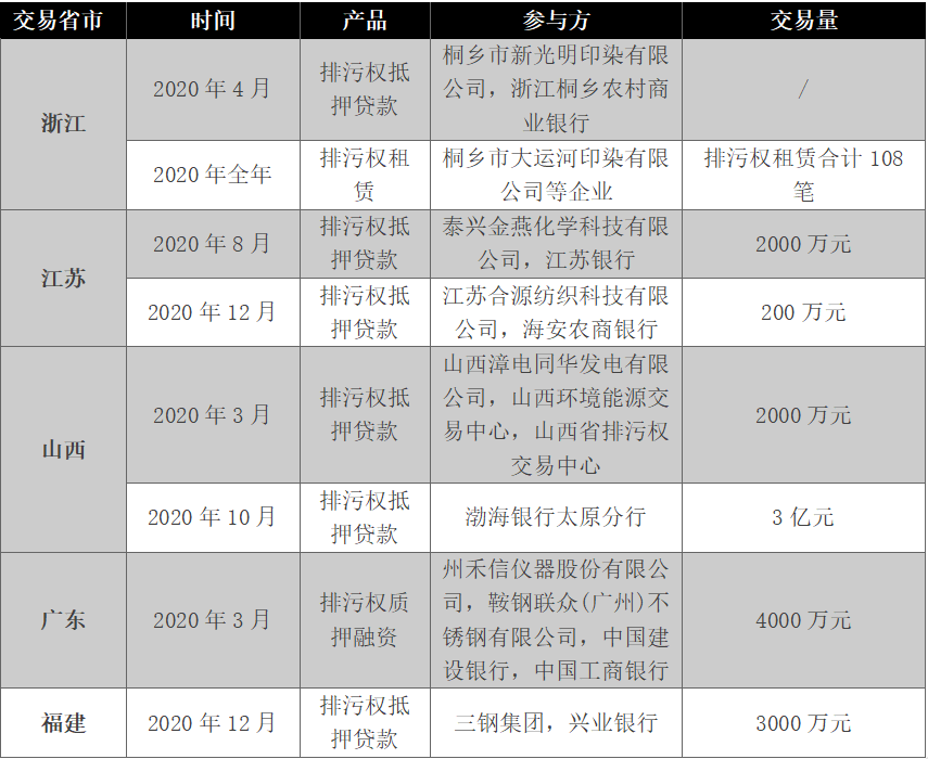 表1 2020年部分省份排污權(quán)融資工具