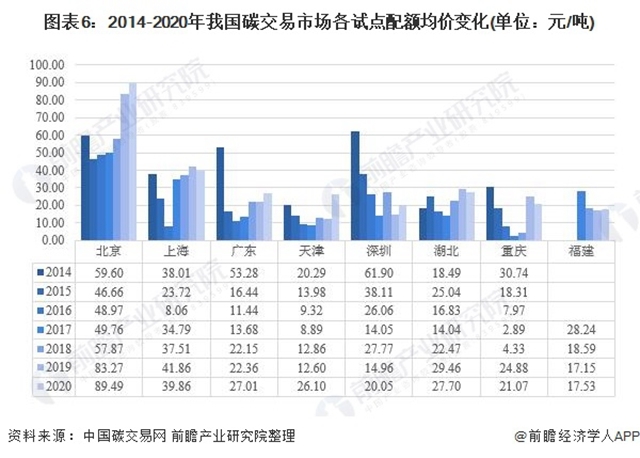 從現(xiàn)階段碳交易試點(diǎn)的配額價(jià)格情況看,各地迥異的總量確定方法和配額分配方案導(dǎo)致碳價(jià)格差異較大。從圖中可以看出北京碳交易市場(chǎng)的配額均價(jià)為所有試點(diǎn)中最高的,2020年市場(chǎng)均價(jià)為每噸89.49元。其余市場(chǎng)的2020年配額均價(jià)都在每噸40元以下,并且深圳市場(chǎng)、福建市場(chǎng)的單價(jià)仍然存有明顯的下降趨勢(shì)。