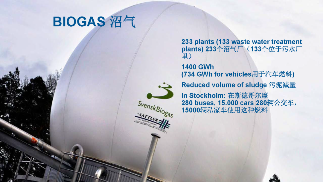 其他的一些技術(shù)手段,很重要的,也是一直在推廣的,就是沼氣。瑞典國(guó)家不大,只有一千萬(wàn)人口,但是它的沼氣工廠還是相對(duì)比較多的。這個(gè)不是最新的數(shù)據(jù),最新的有250、260個(gè),其中一半以上位于污水處理廠,為什么是這樣呢?因?yàn)槭姓鬯幚砻刻鞎?huì)產(chǎn)生很固定的很多的污泥,污泥在瑞典全部是用來(lái)生產(chǎn)沼氣的。不像中國(guó),中國(guó)目前很多的污泥都很難處理。