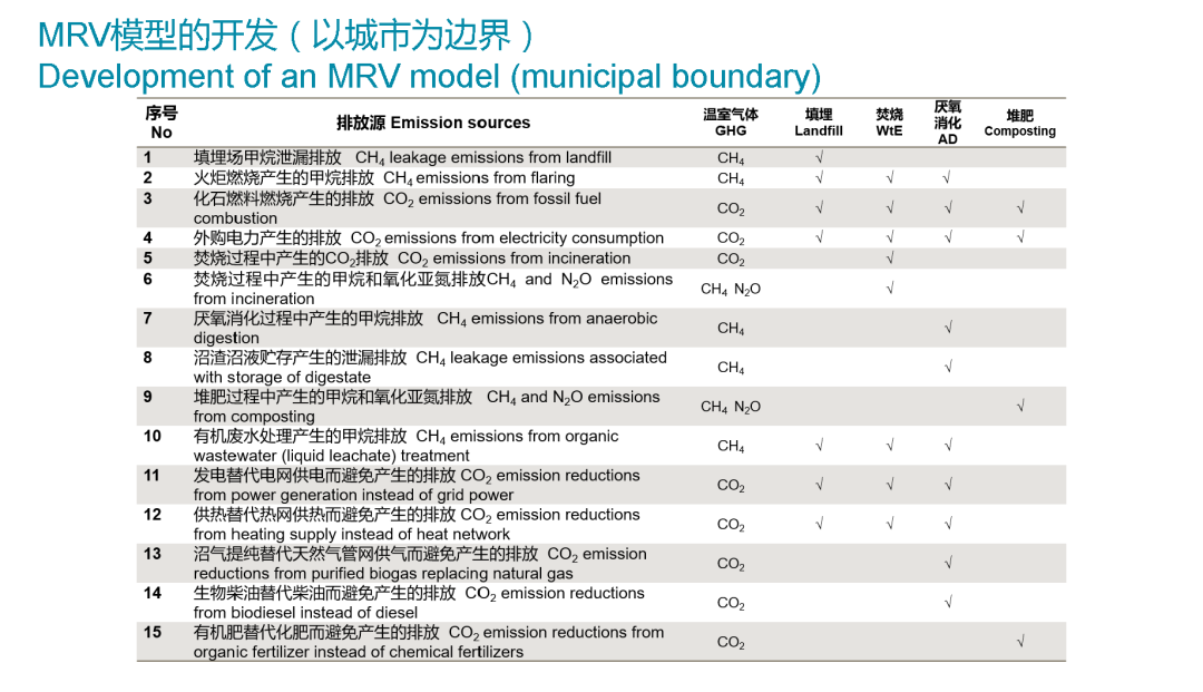通過綜合的識別,我們對整個在城市范圍內(nèi)的垃圾管理有哪些是可能的和碳排放相關的排放源,我們識別出15個核心的排放源。溫室氣體的排放種類不僅有二氧化碳,也關注了甲烷和氧化亞氮,我們是非常創(chuàng)新和領先,針對焚燒廠可能會有一些氧化亞氮的排放,雖然排放量可能非常小,但是它的溫室氣體排放的潛力比二氧化碳,它的倍數(shù)是很高的,所以我們覺得應該想要對它做一個監(jiān)測。