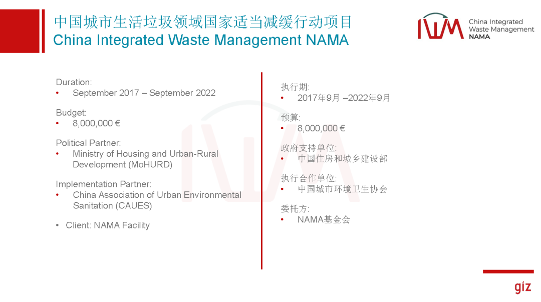 我們其實相對來說比較早,在2017年的時候,這個概念是在15年就提出來了,在2017年的時候拿到了那馬基金會的支持,基金會也是由德國、丹麥、歐盟以及英國四個國家共同成立的一個基金會,主要就是支持我們發(fā)展中國家在不同的領域探索我們是不是能夠更減排。我們這個項目中方的政府支持單位是住建部,很榮幸能夠得到部里的支持,中國的執(zhí)行合作伙伴是中環(huán)協(xié),項目執(zhí)行期是五年,今年是第四年,預計明年九月正式結(jié)束。我們現(xiàn)在有四年多的數(shù)據(jù)能跟大家分享一下,看看我們干了什么。