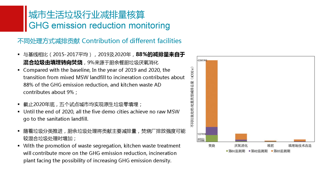 這里面也得到了試點城市特別主動的支持,在西安他們新建的焚燒廠配備了設備,這給我們國家的焚燒企業(yè)將來在這個行業(yè)里面他們的氧化亞氮的排放情況怎么樣,能夠提供第一手的數(shù)據(jù)。在這個基礎模型的處置上,我們有了幾個基線選擇,選擇了2015到17年三年的平均值,作為我們整個項目的基線。在這之后,2019年和2020年我們兩年分別去這五個城市做了監(jiān)測,可以看出有一些初步的結(jié)論。第一關于減排量和排放強度,這兩年從19年和20年,與基線相比,五個城市累計實現(xiàn)減排量260萬噸二氧化碳當量,這個相當于是180萬畝植樹造林,一年的碳匯地量,也是非常可觀的數(shù)據(jù)。除了排放總量,會有一個特別好的數(shù)值就是排放強度,垃圾管理行業(yè)排放強度是多少,從基線值到2020年,我們五個城市平均碳排放強度從0.8噸二氧化碳當量每噸垃圾降到了0.5,能夠看出中國垃圾行業(yè)以五個試點城市為例,已經(jīng)實現(xiàn)向低碳化發(fā)展的轉(zhuǎn)型。碳排放強度的降低已經(jīng)達到了40%以上,能夠看到我們行業(yè)是在更清潔、更低碳,這個是一個特別有意義的數(shù)據(jù)。我們也分享給我們總部以及國際同事,他們非常認可,能夠看到中國垃圾行業(yè)在向低碳方面轉(zhuǎn)型升級。
