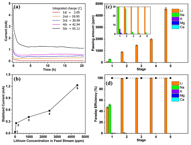 圖2.(a)提鋰過程中每一級的計時電流曲線,曲線與時間的積分即為該過程中遷移的總電荷量;(b)提鋰過程中穩(wěn)定電流與原料鋰濃度的關(guān)系;(c)提鋰過程中每一級的離子通過量;插圖顯示情節(jié)在低范圍內(nèi),以幫助查看干擾離子的結(jié)果:(d)提鋰過程中每一級中不同離子的遷移對電流的貢獻率。實心方塊表示總體效率(100%)。