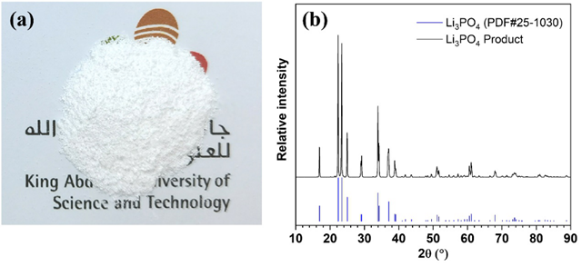 圖3.(a) 磷酸鋰產(chǎn)品;(b)磷酸鋰產(chǎn)品的XRD圖,附上標準圖譜作為對比。