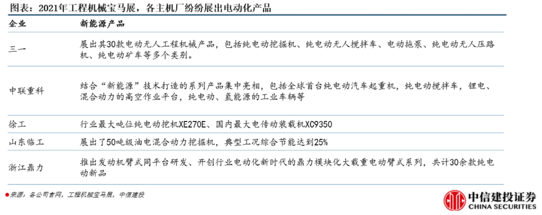 工程機械龍頭企業(yè)在電動化領域研發(fā)實力更強,布局更早,將引領行業(yè)進步與變化,重點推薦三一重工、中聯重科、徐工機械。