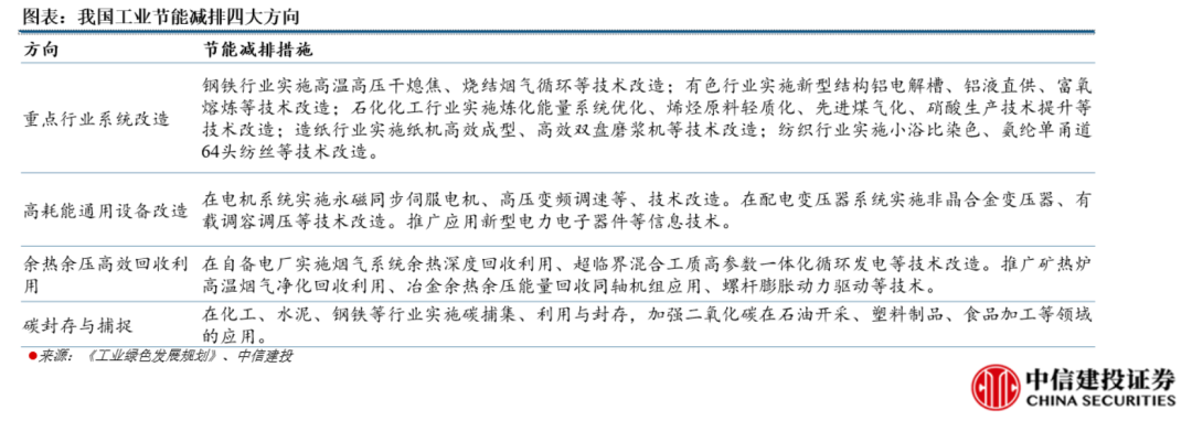在碳達峰的背景下,我國工業(yè)將加快節(jié)能減排改造。從具體措施來看,我國工業(yè)節(jié)能減排主要通過傳統(tǒng)工業(yè)領域系統(tǒng)改造、高耗能通用設備改造、余熱余壓高效回收利用、碳封存與捕捉等措施來實現節(jié)能減排。