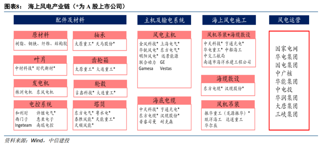 在“3060”目標背景下,我們建議重點關注海上風電產業(yè)鏈。海上風電產業(yè)鏈主要包括如下環(huán)節(jié):上游配件及材料,主要包括葉片、塔筒、軸承、齒輪箱、電控系統(tǒng)等;中游風電主機、海底電纜及海上風電施工;下游海上風電運營。中天科技與亨通光電業(yè)務范圍涵蓋海纜生產、風機吊裝及海纜敷設等。從成本構成來看,風機及塔筒、建設安裝費用、海纜費用(站內海纜+送出海纜)、相關電氣設備(升壓、換流)、其他費用(海地使用費、利息等)成本占比分別約為45%、35%、8%、5%、7%。