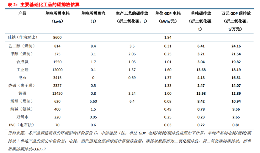 根據計算結果,單位GDP碳排放居于前列的基礎化工產品分別是煤制乙二醇、煤制甲醇、合成氨、工業(yè)硅、電石、燒堿、黃磷、MTO、純堿。集中在低附加值的大宗化工品,基本上與電耗高/電力成本占比高的產品相吻合。同時,也與內蒙古給出的禁止新建產能的化工品清單基本吻合。