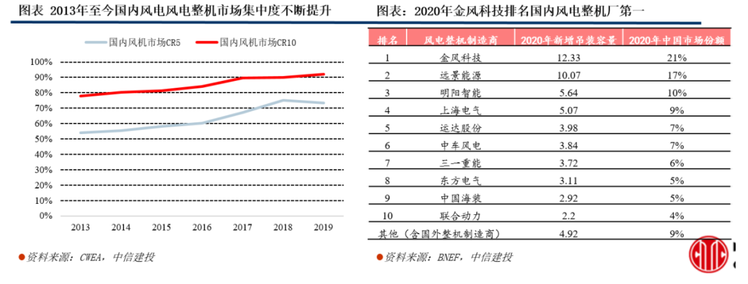 國內風電整機市場(含原材料及零部件)規(guī)模超千億,行業(yè)集中度高。從風電場資本開支構成來看,國內風電整機市場(含原材料及零部件)規(guī)模超千億元。風電場資本開支由風電整機、系統(tǒng)平衡(電氣基礎設施、組裝和安裝)以及財務費用(保險、建筑融資等)組成,其中陸地風電場資本開支中風電整機投入占比約65-70%,以此推算,國內風電整機市場(含原材料及零部件)規(guī)模超千億元。重點推薦風電整機龍頭金風科技。