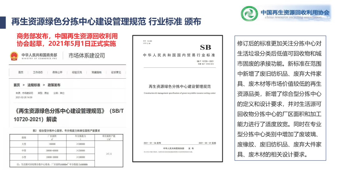 我們特意強(qiáng)調(diào)了一下,修了三年,這個(gè)標(biāo)準(zhǔn)今年終于發(fā)布了。一出來社會反響特別大,關(guān)注分揀中心的合規(guī)性,一定要讓規(guī)范的企業(yè)沖到市場主體,去承擔(dān)相應(yīng)的體系建設(shè)的任務(wù),所以酒吧相應(yīng)的標(biāo)準(zhǔn)強(qiáng)調(diào)了,也增加了生活源分類后回收物去承接的功能。就是把再生資源分揀中心完全打造成服務(wù)于城市固廢服務(wù)一個(gè)重要的節(jié)點(diǎn),這是一個(gè)很重要的標(biāo)準(zhǔn),也是我們做了三年的一個(gè)結(jié)果。