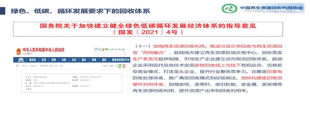 剩下幾個(gè),一個(gè)就是生產(chǎn)者責(zé)任延伸,一個(gè)就是家電,還有回收的模式,線上線下結(jié)合,包括加強(qiáng)循環(huán)利用,我讀了十一條之后,都點(diǎn)到了,我個(gè)人理解它是從體系建設(shè)來抓,每句話說的都是怎么樣健全完善資源回收的體系,從體系的角度去講的,而不是前幾年打造基地,打造園區(qū),打造回收站點(diǎn),現(xiàn)在是說從體系建設(shè)上來提高它的資源回收利用率。