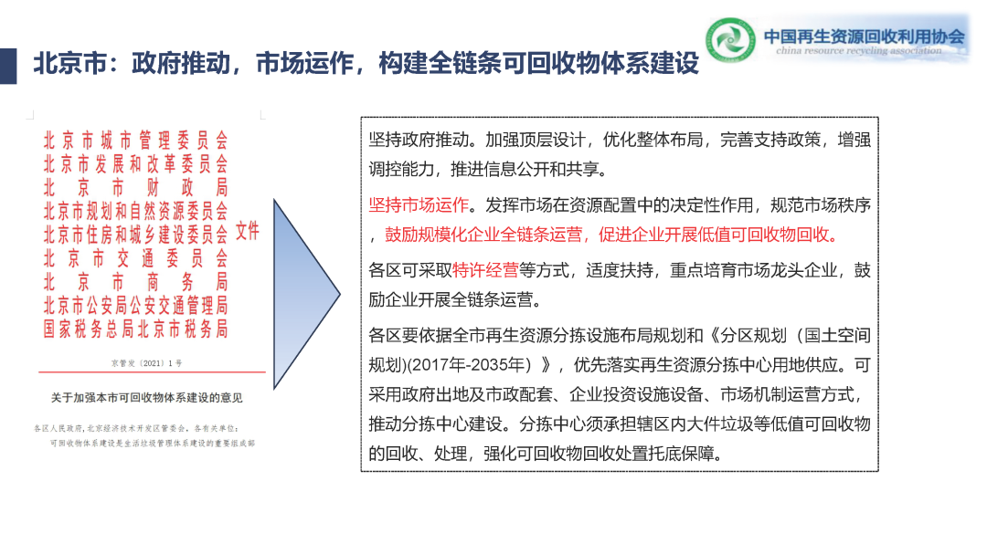 后面想跟大家分享的就是各地方政府在推動全鏈條回收體系建設(shè)的一些舉措,我們最熟悉北京,我們跟蹤北京跟蹤了四五年的服務(wù)。北京市今年了一號文,題目就是加強(qiáng)本市可回收物體系建設(shè)的意見,我們張主任特別清楚,天天市里面都在想辦法貫徹這個(gè)文件,抓各區(qū)的體系建設(shè)。
