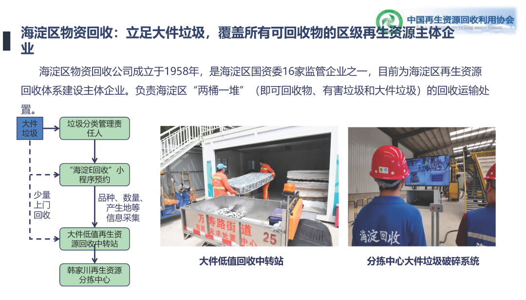 海淀物回是海淀區(qū)的國企,他現(xiàn)在的模式是只收低值。他原來末端有分揀中心的,現(xiàn)在他做物業(yè)經(jīng)營的分揀中心,自己直接運(yùn)營,就做低值大件。低值大件體系建起來以后,可以往上附加其他的可回收物了。但低值這兒是由區(qū)政府兜底,給他相應(yīng)的財(cái)政補(bǔ)貼。