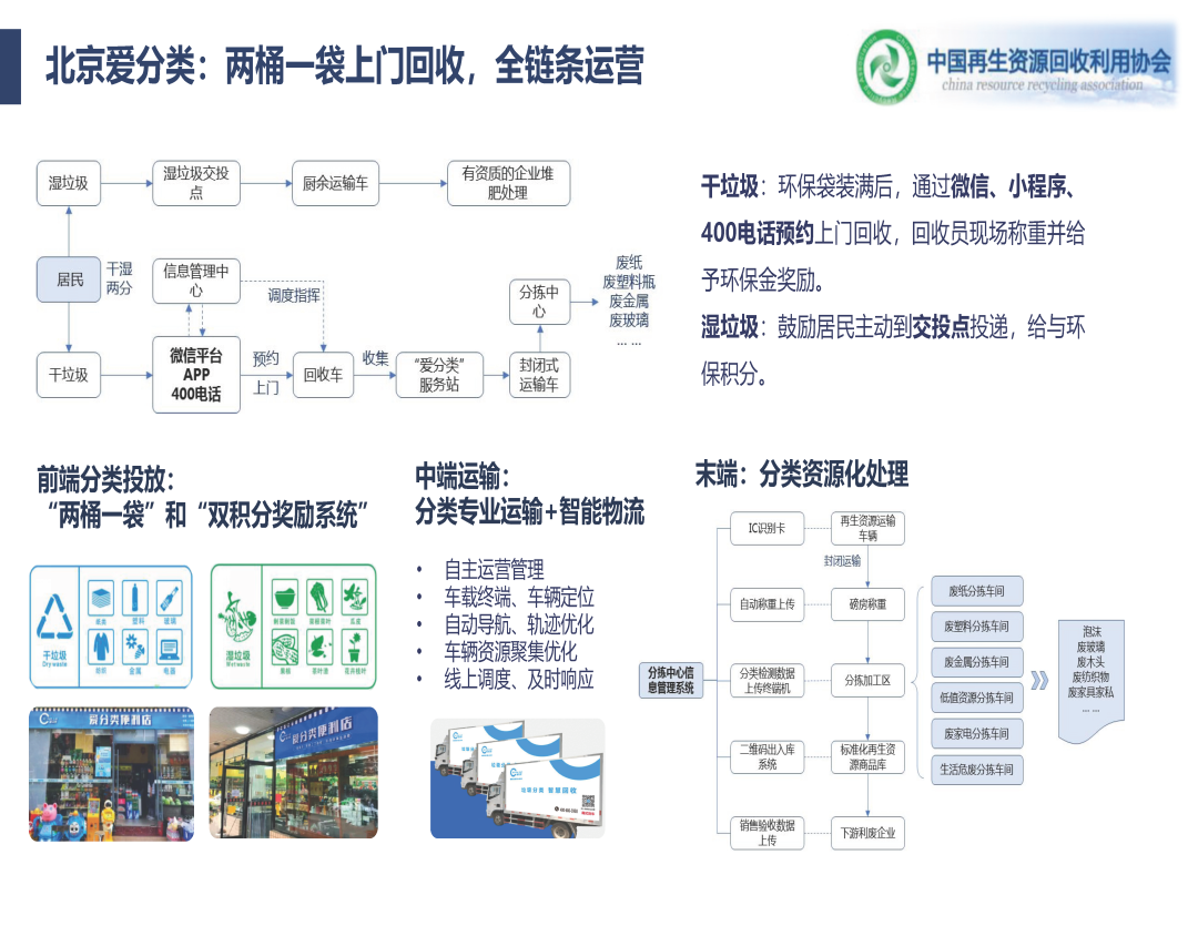 可回收物我們也是跟蹤了很多小區(qū)的生活垃圾分類的情況,各個(gè)大類的組分,可回收物回收量,我說的35是從居民家里面出來,上門回收兩桶一袋,比較了一下小區(qū)其他的廚余,其他有害垃圾的量,可回收物的量能占到35%。因?yàn)榇蠹覕?shù)據(jù)不可得,把廚余垃圾加進(jìn)來。可回收物妥善回收了,就能達(dá)到這個(gè)目標(biāo)值。減量是關(guān)鍵,也不是我們提出,幾年前我們在想是不是去論證什么樣的一個(gè)體系是最經(jīng)濟(jì)、最可持續(xù)的,現(xiàn)在各個(gè)地方企業(yè)自己也走出來了。全品類、全流程、可溯源的新型的回收處理體系,是符合管理要求的,也符合企業(yè)運(yùn)營的實(shí)際情況。