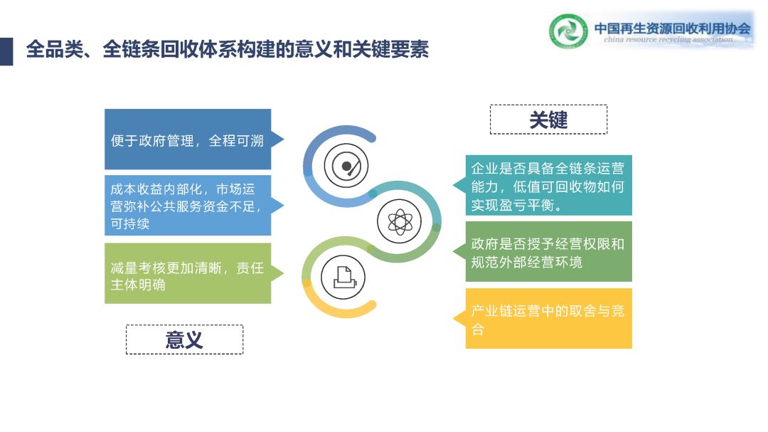 意義說過了,不再說了。關(guān)鍵是什么?首先是否企業(yè)具備再生資源運(yùn)營的能力,這是很重要的。不是都給到你了,他能把再生資源的價(jià)值最大化,可能他實(shí)現(xiàn)不了盈虧平衡政府要看他是否具備這種能力。第二是政府這方面,你是否授予了特許經(jīng)營的權(quán)限,如果他不是一個(gè)區(qū)域拿到一定規(guī)模的經(jīng)營權(quán)的話,他是很難盈虧平衡的。還有就是你是否給他規(guī)范了外部的經(jīng)營環(huán)境,如果不做到這一點(diǎn),政府就要一直補(bǔ)這個(gè)企業(yè)。因?yàn)橥獾匾恢庇杏紊檀嬖冢揪湍貌坏絻r(jià)值高的資源。第三從企業(yè)層面自身去考慮的,產(chǎn)業(yè)鏈中很多地方不應(yīng)該自己直接經(jīng)營的,要比較一下成本收益,有時(shí)候就要合作,怎么把現(xiàn)有的社會上的游商去整編它,怎么和各個(gè)品類的運(yùn)營商去搭平臺,一家企業(yè)做不了全鏈條所有的事情,要進(jìn)行整合。我們今天也在說虎哥這個(gè)事,政府出錢,政府什么事該出錢,什么事不該出錢,其實(shí)是特別基礎(chǔ)的一個(gè)課題研究。再生資源從五幾年開始,政府說全國要大力倡導(dǎo)回收,已經(jīng)存在的一個(gè)行業(yè),突然之間大家覺得要錢補(bǔ)才能干,政府過不來這個(gè)勁。我們要把它掰清楚,你讓我干的哪些事情是我原來本行業(yè)能干的,哪些事情是你附加給我的公共服務(wù)的職能,這是要厘清的。