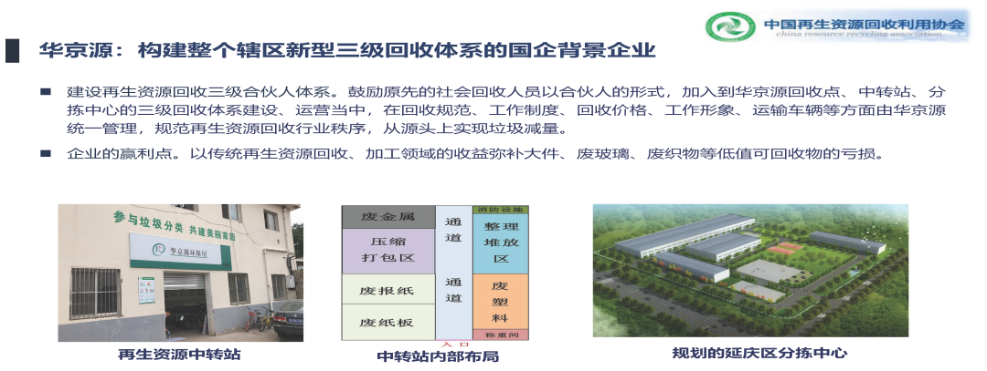 在北京有兩家企業(yè)很有名,就是行業(yè)內(nèi)的,現(xiàn)在在做整個(gè)體系的,一個(gè)是華京源,也是我的一個(gè)兄弟單位,中國再生資源公司下屬的子公司,他傳統(tǒng)就是做末端分揀中心經(jīng)營的,這四五年在前端做。現(xiàn)在在北京延慶區(qū)、通州區(qū)、豐臺區(qū)包括西城一部分都是華京源在做主體企業(yè),建立了三級回收體系。從它社區(qū)的分類驛站開始布,然后到中轉(zhuǎn)站,到末端的分揀中心,全鏈條的在運(yùn)營,而且高值低值都收。就是我們剛才說的這種模式,但是華京源面臨很多問題,企業(yè)已經(jīng)提前支付了太多的成本。