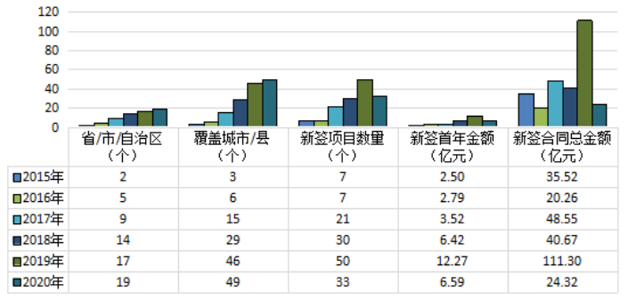 2020年,龍馬環(huán)衛(wèi)新增中標(biāo)環(huán)衛(wèi)服務(wù)項(xiàng)目 33 個,新簽合同年化金額 6.59 億元,同比下降 46.29%,新簽合同總金額 24.32 億元,同比下降 78.15%。