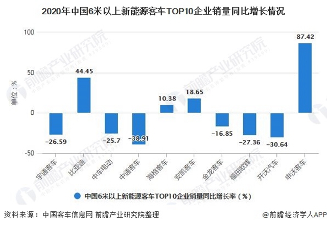 從銷量前10企業(yè)的銷售增長情況來看,2020年1-12月份,在新能源客車行業(yè)市場整體銷量大幅縮減背景下,僅有比亞迪、海格客車、安凱客車和申沃客車四家企業(yè)實現(xiàn)正增長,其中比亞迪增長率達到44.45%,逆勢增長的勢頭迅猛。