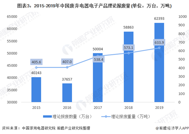2015年以來,我國廢棄電器電子產品理論報廢數(shù)量整體呈上升趨勢,理論報廢重量逐年上升,2019年,我國14種廢棄電器電子產品理論報廢數(shù)量達62393萬臺,理論報廢重量達633.92萬噸。