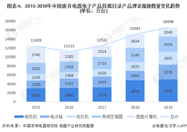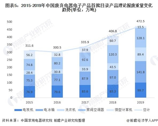 從理論報廢重量上看,2015-2019年,我國廢棄電器電子產品首批目錄產品理論報廢重量整體呈上升趨勢,2019年達472.5萬臺。具體來看,我國電視機、電冰箱、洗衣機、房間空調器理論報廢重量均呈上升趨勢,微型計算機理論報廢重量波動較大。