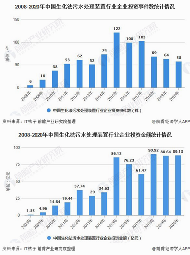 根據(jù)IT桔子的數(shù)據(jù)顯示,2008-2020年生化法污水處理裝置行業(yè)企業(yè)投資事件呈現(xiàn)波動趨勢。在2015年,中國生化法污水處理裝置行業(yè)企業(yè)投資事件達到近年來峰值122件,但投資金額為86.12億元。從投資金額角度來看,在2018年,生化法污水處理裝置行業(yè)企業(yè)投資達到了近年來峰值90.92億元。