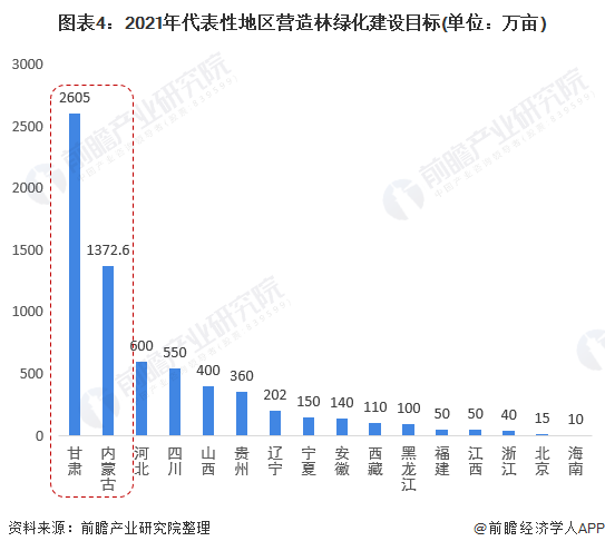 現(xiàn)階段,生態(tài)文明建設(shè)提升到新的戰(zhàn)略高度,造林綠化事業(yè)作為建設(shè)森林生態(tài)系統(tǒng)的主體,造林綠化成改善生態(tài)環(huán)境建設(shè)的重點關(guān)注領(lǐng)域,故此,代表性地區(qū)專門針對營造林綠化建設(shè)提出切實可行的發(fā)展目標(biāo)。其中甘肅、內(nèi)蒙古地區(qū)營造林綠化建設(shè)目標(biāo)均超過1000萬畝。