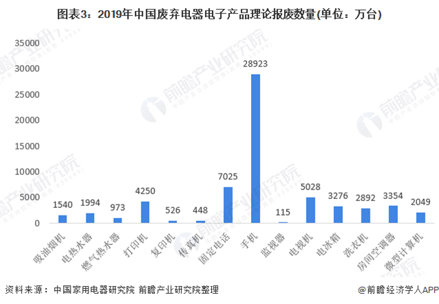 在新公布的《廢棄電器電子產(chǎn)品處理目錄(2014年版)》中,類型有所增加,包含電視機、電冰箱、洗衣機、房間空調(diào)器、微型計算機、吸油煙機、電熱水器、燃?xì)鉄崴鳌⒋蛴C、復(fù)印機、傳真機、固定電話、手機、監(jiān)視器等14類產(chǎn)品。從各類廢棄電器電子產(chǎn)品理論報廢數(shù)量上看,2019年,手機理論報廢量較大,遠(yuǎn)多于其他廢棄電器電子產(chǎn)品,達(dá)28923萬臺。