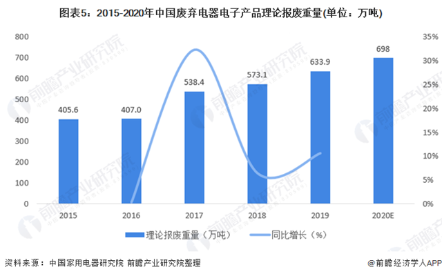根據(jù)中國家用電器研究院數(shù)據(jù)顯示,2015年以來,我國廢棄電器電子產(chǎn)品理論報廢重量逐年上升,2019年,我國廢棄電器電子產(chǎn)品理論報廢重量達(dá)633.9萬噸,2020年約接近700萬噸。