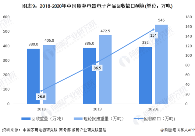 綜合2018-2019年中國家用電器研究院公布的廢棄電器電子產(chǎn)品修正的理論報廢重量及商務(wù)部所發(fā)布的廢棄電器電子產(chǎn)品回收重量可發(fā)現(xiàn),2018-2019年,我國首批廢棄電器電子目錄產(chǎn)品理論報廢重量高于回收重量,回收缺口上升。2019年,我國首批廢棄電器電子目錄產(chǎn)品回收缺口達(dá)86.5萬噸,回收量占理論報廢量比重為82%。根據(jù)變化趨勢,2020年,回收缺口約達(dá)154萬噸。