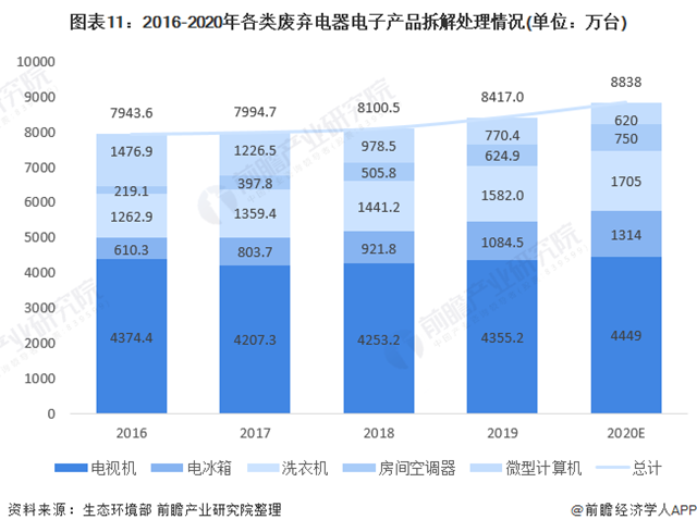 2016-2019年,電視機拆解量變化較為平穩(wěn),電冰箱、洗衣機、微型計算機拆解處理量分別以21%、8%、-20%的增長率復(fù)合增長,房間空調(diào)器增長率逐年下降,2020年約降至20%。依此增長率進行測算,2020年,電視機、電冰箱、洗衣機、房間空調(diào)器、微型計算機拆解量約分別為4449萬臺、1314萬臺、1705萬臺、750萬臺、620萬臺,總計約達(dá)8838萬臺。