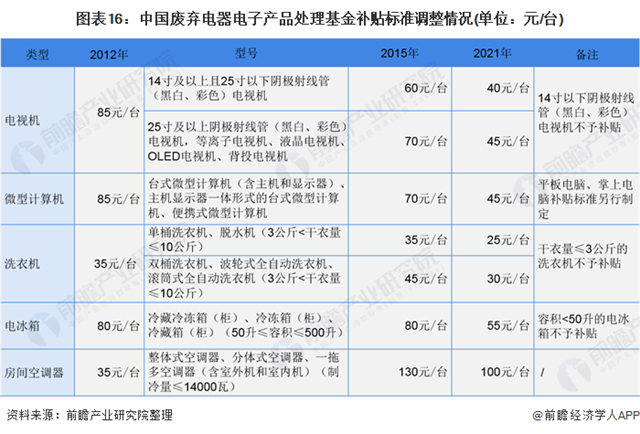 2021年3月,《關(guān)于調(diào)整廢棄電器電子產(chǎn)品處理基金補貼標(biāo)準(zhǔn)的通知》發(fā)布,對廢棄電器電子產(chǎn)品處理基金補貼標(biāo)準(zhǔn)予以調(diào)整。其中,電視機補貼范圍為40-45元/臺,微型計算機45元/臺,洗衣機25-30元/臺,電冰箱55元/臺,房間空調(diào)器100元/臺??傮w來看,與2015年基金補貼標(biāo)準(zhǔn)相比,補貼標(biāo)準(zhǔn)下降。