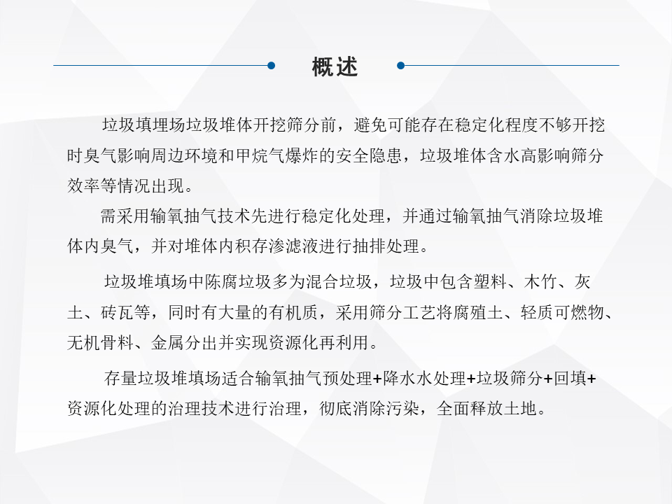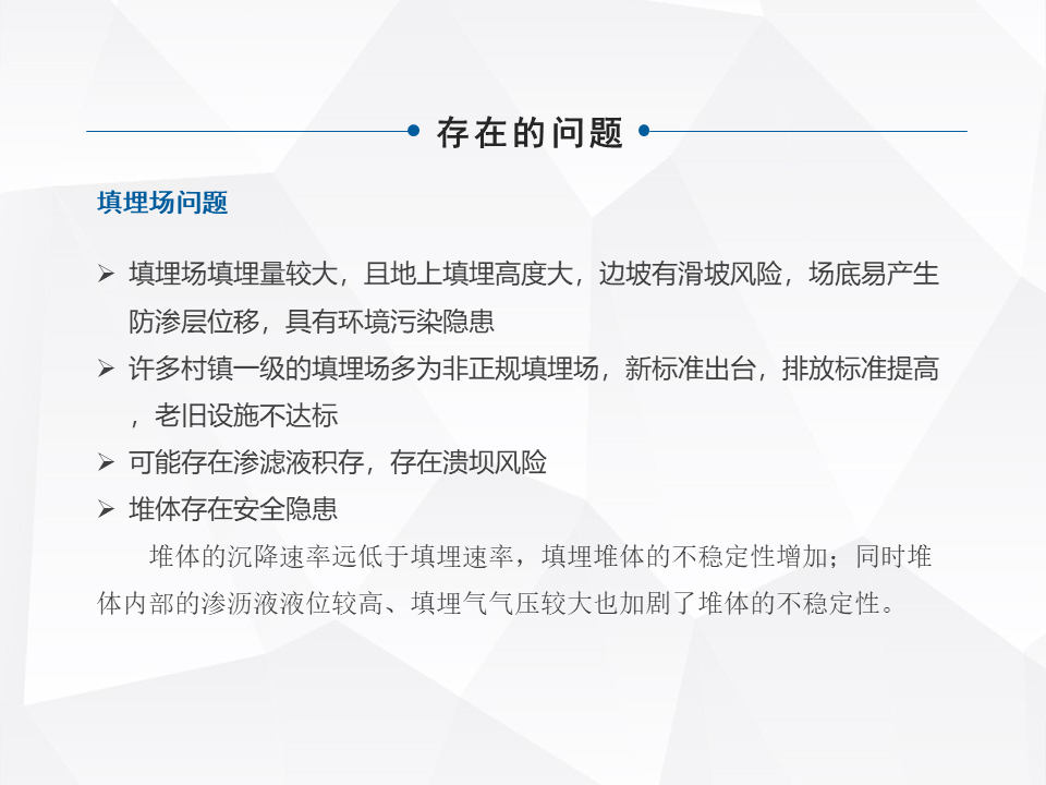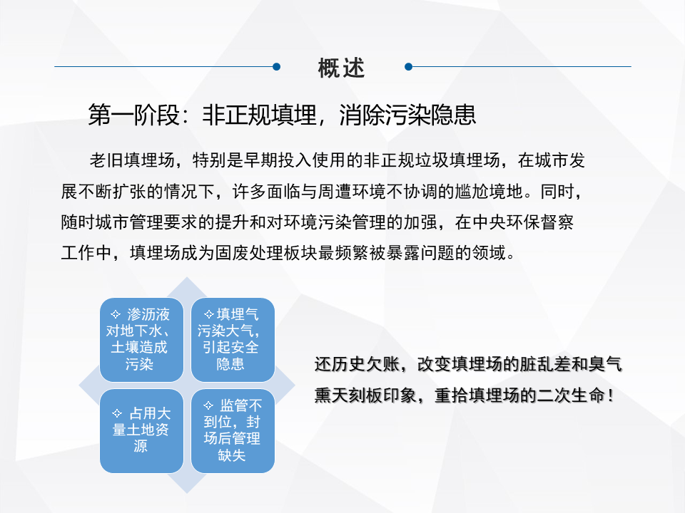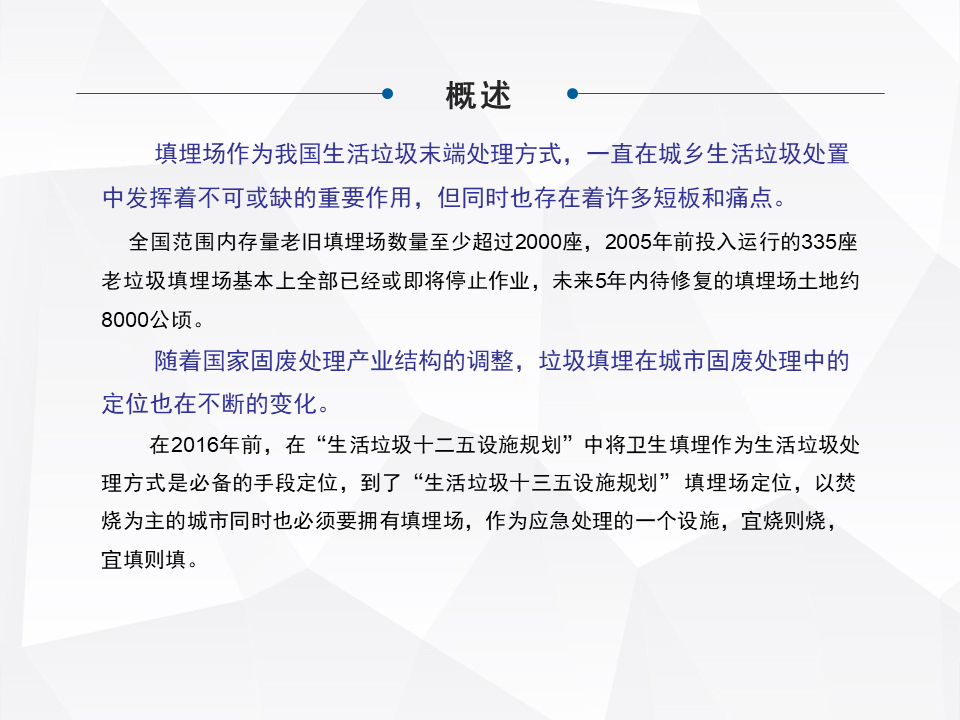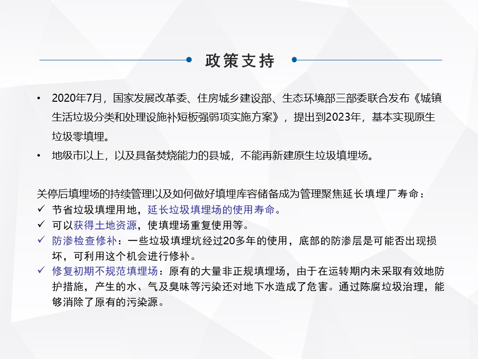 簡單快速地分享一下,老舊填埋場綜合整治,或者現(xiàn)在提出來叫存量垃圾處理,在咱們整個(gè)行業(yè)里面屬于一個(gè)角落。