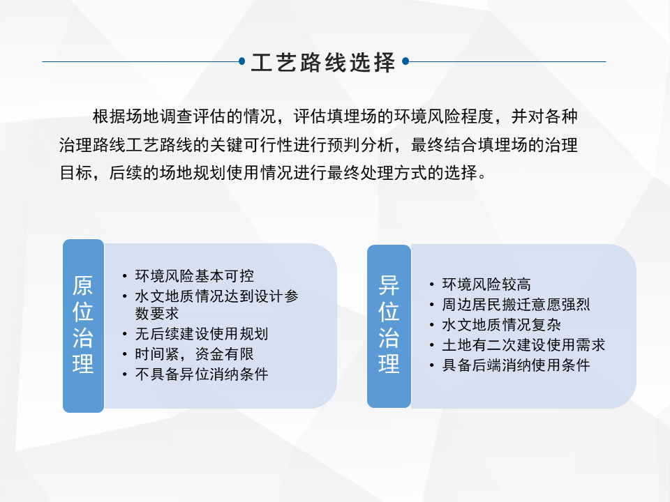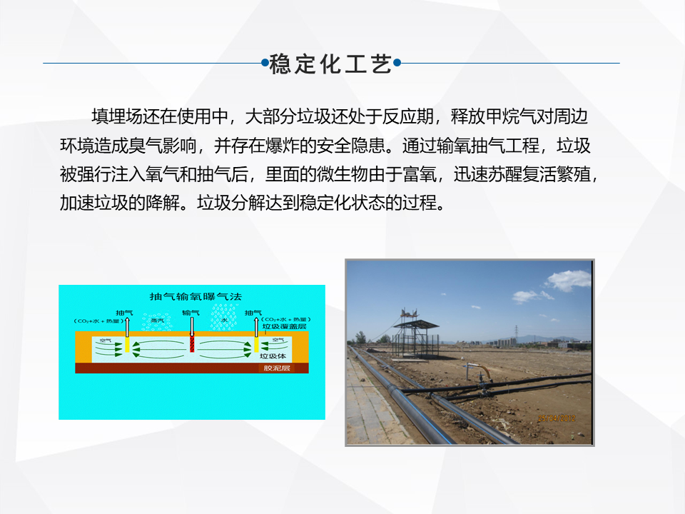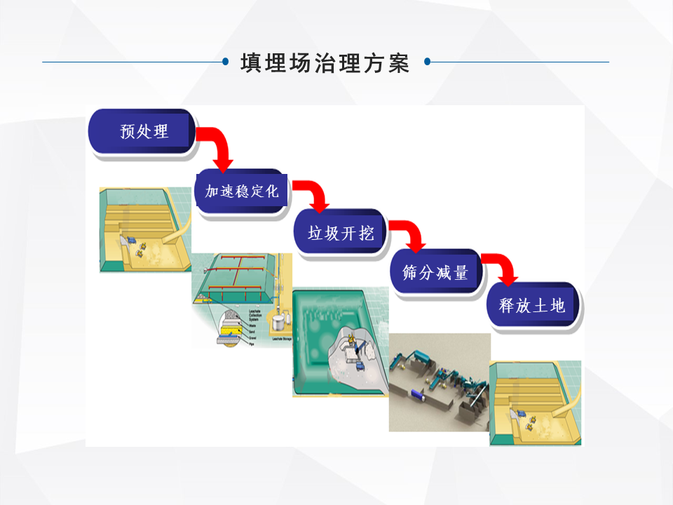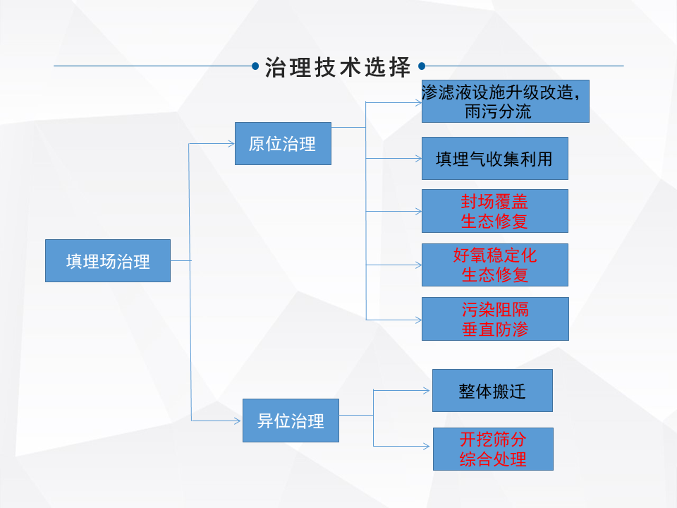 處理的技術(shù)涵蓋的面,整個(gè)行業(yè)涵蓋的面還是比較多的,大的來分,有原位的治理和異位的治理。原味的治理,像衛(wèi)生填埋場和簡易填埋場需要做一些現(xiàn)有的配套設(shè)施的升級(jí),雨污分流,怎么樣能去有效的減少持續(xù)的像滲濾液產(chǎn)生。填埋氣的收集利用,還有有的是直接封廠覆蓋,做生態(tài)修復(fù),還有做一個(gè)加速的酶化以后,再做生態(tài)修復(fù)。還有早期的簡易填埋,甚至沒有做防滲的,在現(xiàn)有不具備整體搬遷的條件下,去做一些污染阻隔。