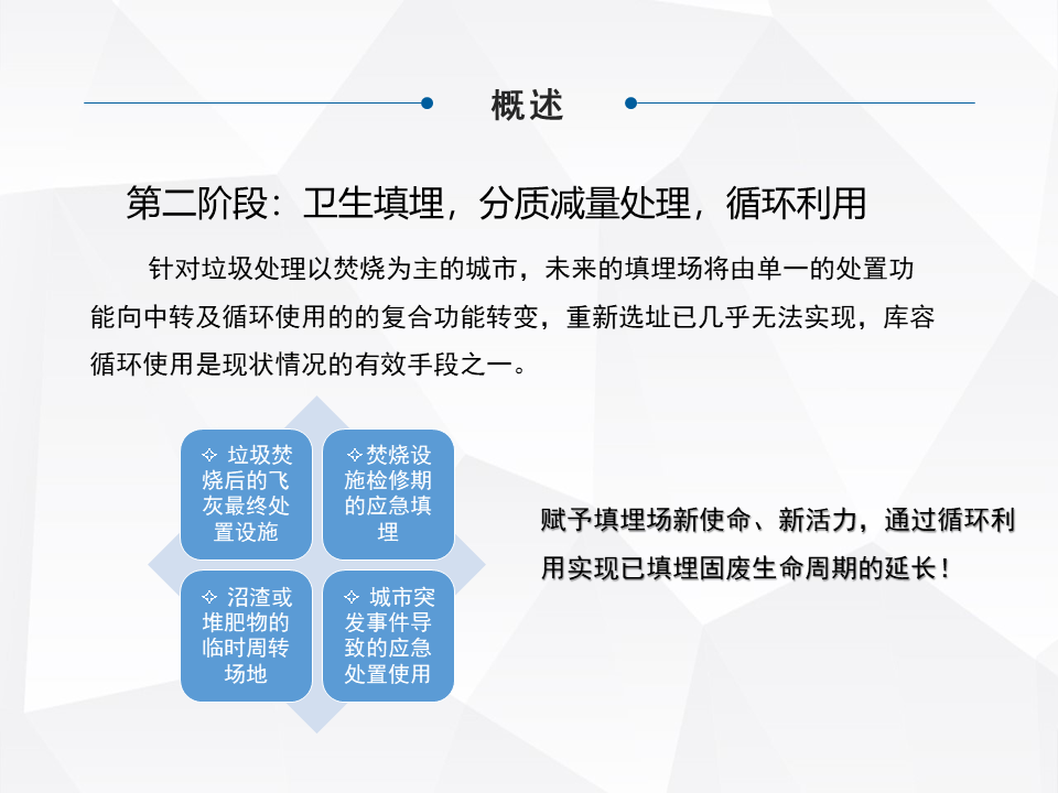 第二個(gè)階段,“十二五”、“十三五”主要針對(duì)非正規(guī)填埋場的治理,到“十四五”或者未來的十年,目前已經(jīng)開始關(guān)注新的填埋場由單一的處理功能向中轉(zhuǎn)和循環(huán)使用的復(fù)合功能區(qū)轉(zhuǎn)變,很多都是對(duì)填埋場的場地有再利用的需求,或者對(duì)庫容有循環(huán)利用的需求。近幾年,特別是北上廣深這些土地比較緊缺的,人口比較密集的城市,最早開始關(guān)注到這個(gè)行業(yè)。