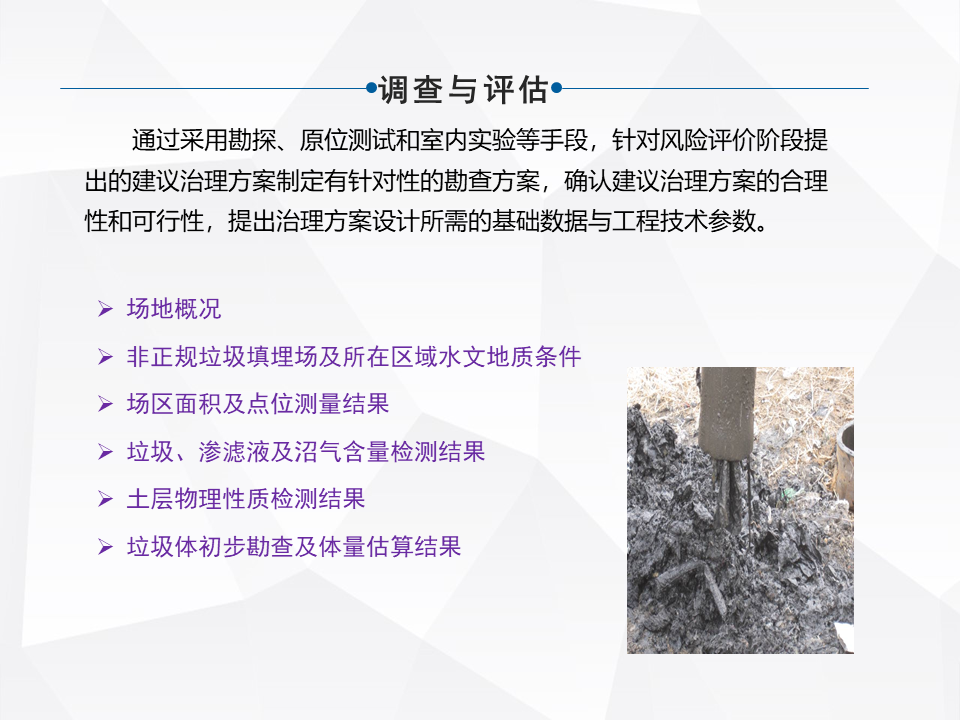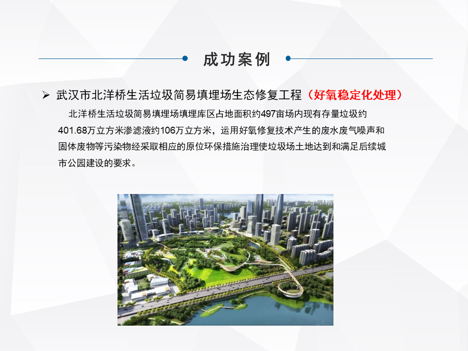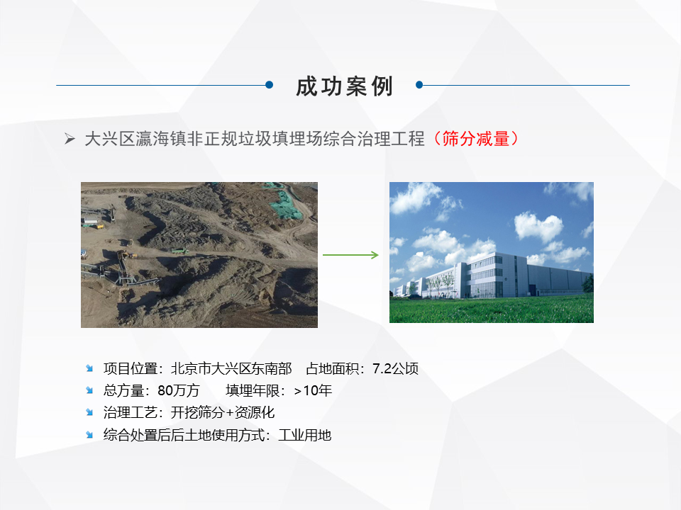 另外一種就是做一個(gè)異位的治理,這是一些小規(guī)模的,城市規(guī)劃了大型的填埋場,對(duì)一些小型的就做整體的搬遷。特別前幾年的時(shí)候,像河北很多地區(qū)整體的做坑塘垃圾的收集,就是把一些小散亂的,集中的匯到一個(gè)地方。還有一塊就是做綜合的處理,我們最早因?yàn)楣疽彩亲龇诌x技術(shù)出來的,最早我們主流是做綜合處理這塊比較多一些。