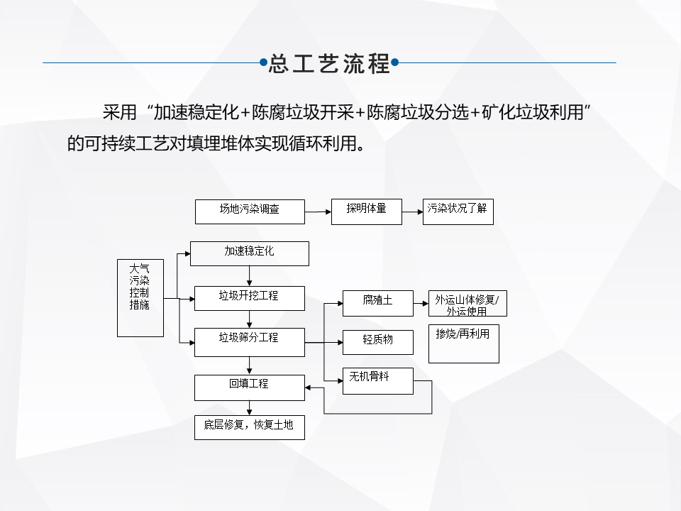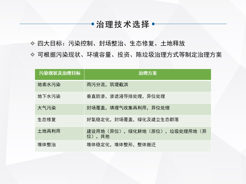 主要實(shí)現(xiàn)的目標(biāo)是兩塊,一塊是從環(huán)境污染控制這一塊來說,另外一塊從占用大量的土地和庫容這塊來說。選擇工藝之前,比較重要的還是要前期做好調(diào)查和評(píng)估。像我們當(dāng)時(shí)北京也是由宗正所在的科研所對(duì)全北京市的已有的已知的非正規(guī)的填埋場進(jìn)行了整體的調(diào)查,調(diào)查完了以后,根據(jù)所有填埋場的庫容,它所在的位置,周圍跟底細(xì)水地表水的污染狀況,來進(jìn)行評(píng)級(jí)。根據(jù)評(píng)級(jí)的情況來選擇不同的治理工藝,然后再進(jìn)行分批實(shí)施。