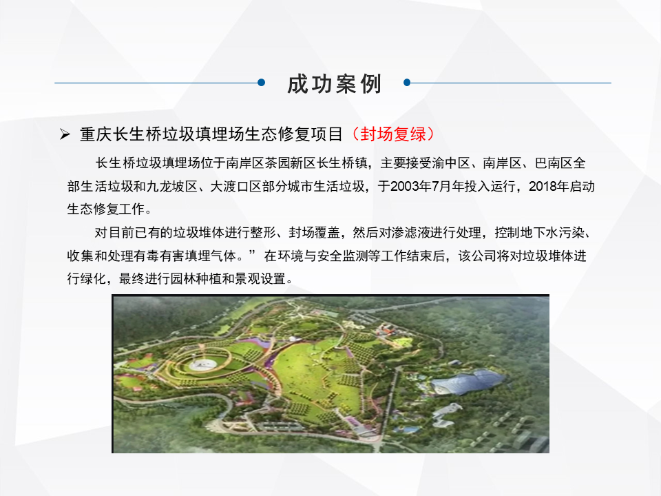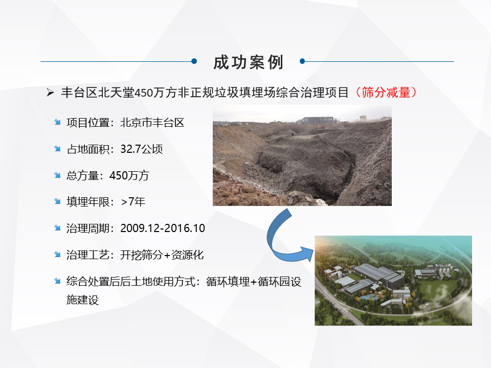 這是我們最早做的一個(gè),最早的正規(guī)填埋場,剛才我提到的那兩個(gè)都是受控的,政府統(tǒng)一管理的衛(wèi)生填埋場,集中填埋的。最早我們做的這個(gè),早期沒在政府監(jiān)管范圍內(nèi)的建筑垃圾、生活垃圾混填的那種。這個(gè)也是那一批做的,是用作工業(yè)用地。政策上,“十二五”、“十三五”部里面也是首次提出來存量垃圾治理,每個(gè)行業(yè)它的需求也是隨著發(fā)展,在“十二五”之前并不是沒有問題,也是先解決眼前的問題,轉(zhuǎn)過頭來,再有能力的時(shí)候,就把當(dāng)時(shí)的一些問題解決。