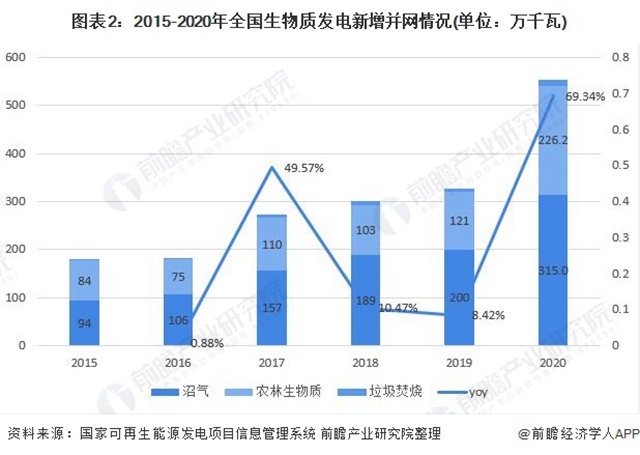 新增垃圾焚燒發(fā)電并網(wǎng)容量占比過半。根據(jù)國家可再生能源發(fā)電項(xiàng)目信息管理系統(tǒng)監(jiān)測數(shù)據(jù)顯示,2020年,全國生物質(zhì)發(fā)電新增并網(wǎng)容量553.6萬千瓦,同比增長接近70%。其中,垃圾焚燒發(fā)電315.0萬千瓦,農(nóng)林生物質(zhì)發(fā)電226.2 萬千瓦,沼氣發(fā)電12.5萬千瓦。