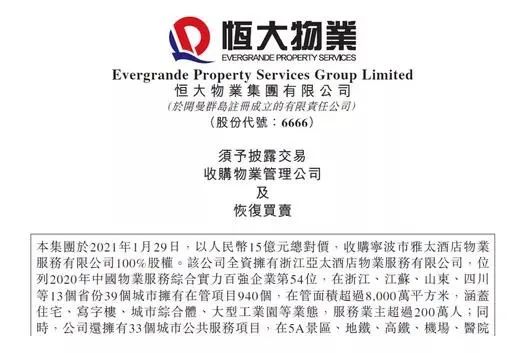 根據(jù)公告,集團(tuán)已簽訂一份不具法律約束力的框架協(xié)議,據(jù)此,擬收購(gòu)安徽宇潤(rùn)的51%股權(quán),總對(duì)價(jià)為人民幣1.53億元。此外,集團(tuán)亦通過(guò)股權(quán)收購(gòu)及認(rèn)購(gòu)增發(fā)股權(quán)方式收購(gòu)中航環(huán)衛(wèi)合共30%股權(quán),總對(duì)價(jià)為人民幣3億元。恒大物業(yè)完成15億大手筆并購(gòu),出讓方累計(jì)中標(biāo)環(huán)衛(wèi)項(xiàng)目超過(guò)60個(gè)1月29日,恒大物業(yè)發(fā)布公告稱(chēng),公司斥資15億元收購(gòu)寧波市雅太酒店物業(yè)服務(wù)有限公司100%股權(quán)。