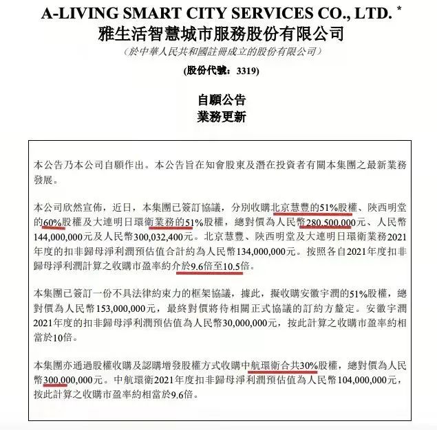 據(jù)此前公告,揚(yáng)子新材控股子公司揚(yáng)新(上海)環(huán)境服務(wù)有限公司(暫定名)擬以自有資金收購(gòu)濱南集團(tuán)51%的股份,交易作價(jià)為人民幣1.67億元。這也意味著,揚(yáng)子新材將正式切入城市服務(wù)這一賽道,邁入“新型材料+城市服務(wù)”的雙主業(yè)發(fā)展模式。雅生活服務(wù)斥資約11.77億元收購(gòu)5家環(huán)衛(wèi)公司股權(quán)3月22日午間,雅生活智慧城市服務(wù)股份有限公司宣布,近日集團(tuán)分別收購(gòu)北京慧豐的51%股權(quán)、陜西明堂的60%股權(quán)及大連明日環(huán)衛(wèi)業(yè)務(wù)的51%股權(quán),總對(duì)價(jià)為人民幣2.805億元、人民幣1.44億元及人民幣約3億元。