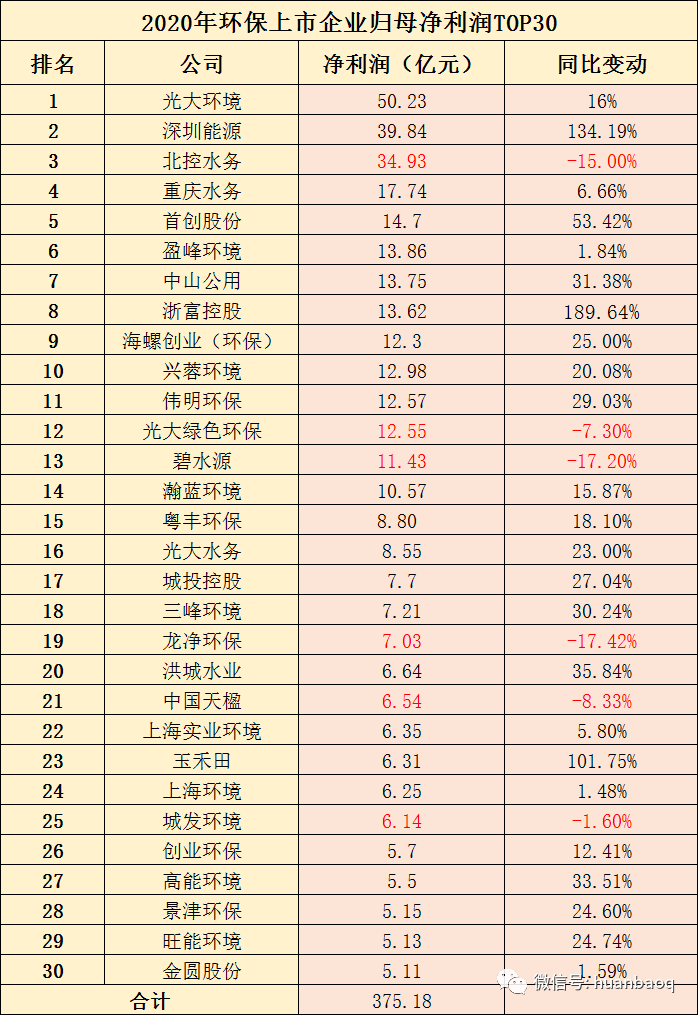 不過,TOP30強(qiáng)中,像業(yè)內(nèi)比較熟悉明星上市環(huán)企,北控水務(wù)、光大綠色環(huán)保、碧水源、龍凈環(huán)保、中國天楹、城發(fā)環(huán)境等,2020年歸母凈利潤都遭到不同程度下滑。