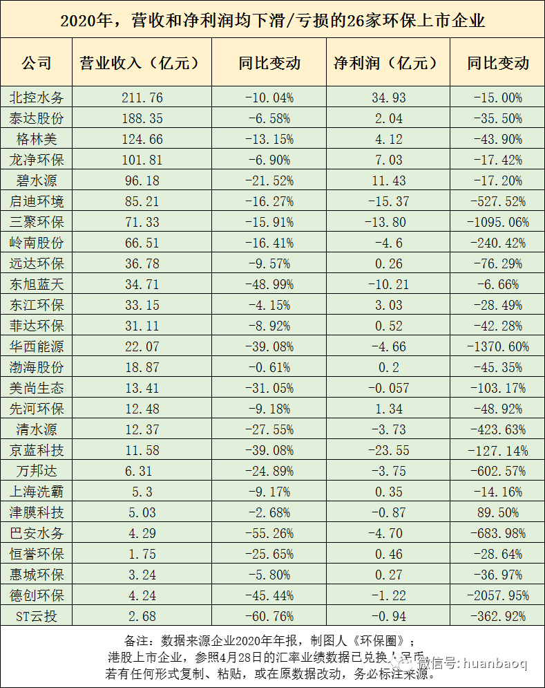 圖二:2020年,營收和凈利潤均下滑/虧損的26家環(huán)保上市企業(yè)