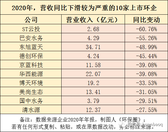 相比上述企業(yè)的出彩表現(xiàn),接下來圖六表格中的ST云投、巴安水務(wù)、東旭藍(lán)天、華西能源、國中水務(wù)、清水源等10家上市環(huán)企的表現(xiàn)則不盡如意,2020年?duì)I業(yè)收入下滑較為嚴(yán)重,降幅最大的前三分別是ST云投、巴安水務(wù)、東旭藍(lán)天。